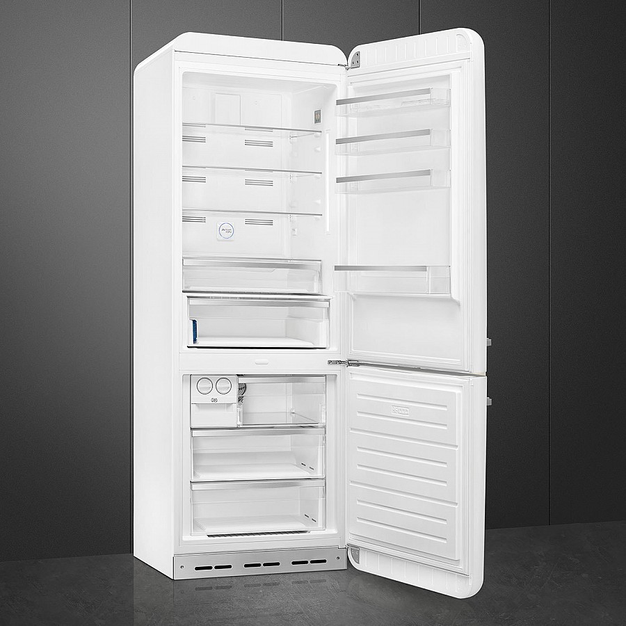 De Smeg FAB38RWH5 is een grote retro jaren 50 koelkast uitgevoerd in een hoogte van 205 cm. en een breedte van 70,6 cm. Daarmee biedt deze koel/vriescombinatie zeer veel inhoud: 333 liter koel en 124 liter vriesruimte.