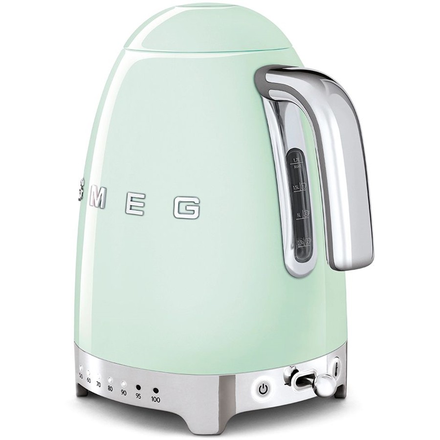De retrostijl van de SMEG waterkoker komt naar voren in de verscheidenheid aan verkrijgbare kleuren: stoere tinten, zoals rood, zwart en wit en zachte pastelkleuren zoals crème, groen, roze en blauw. Deze kleuren versterken de chromen bodem en de roestvrijstalen details van de schenktuit en de bedieningsknoppen.