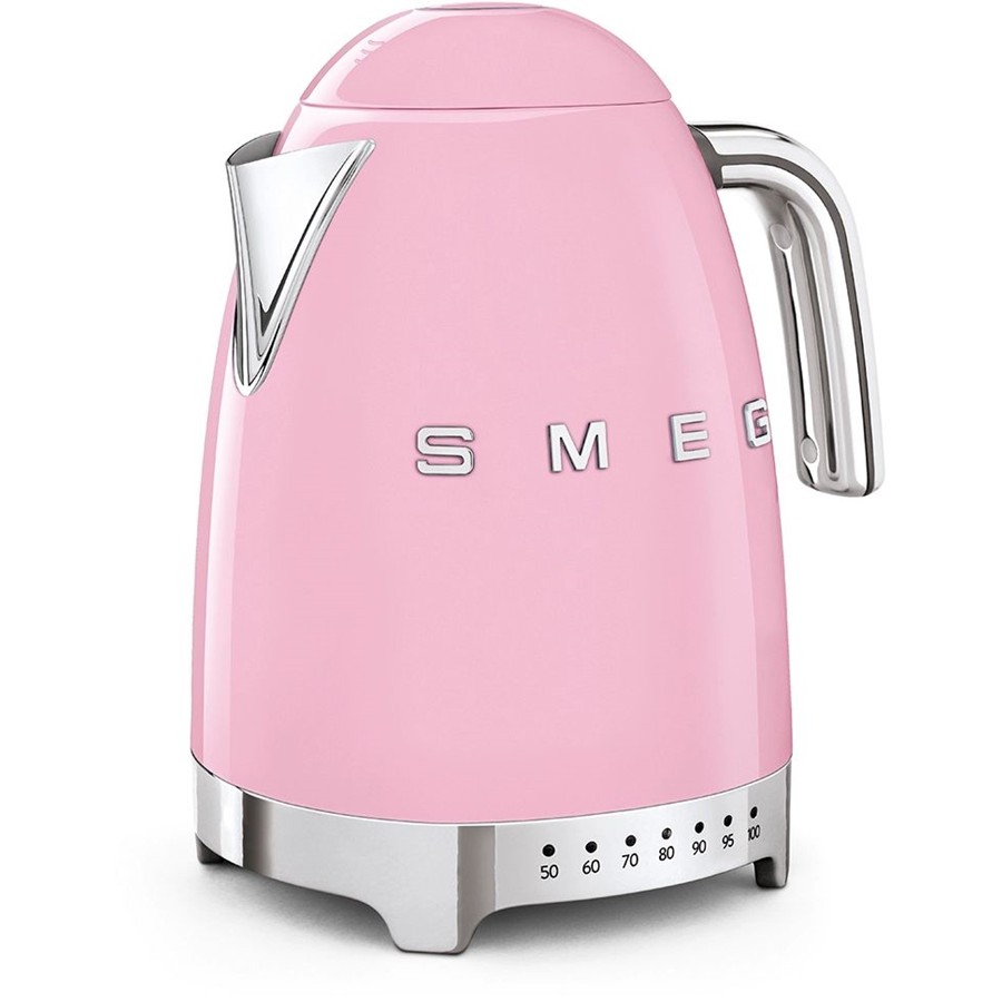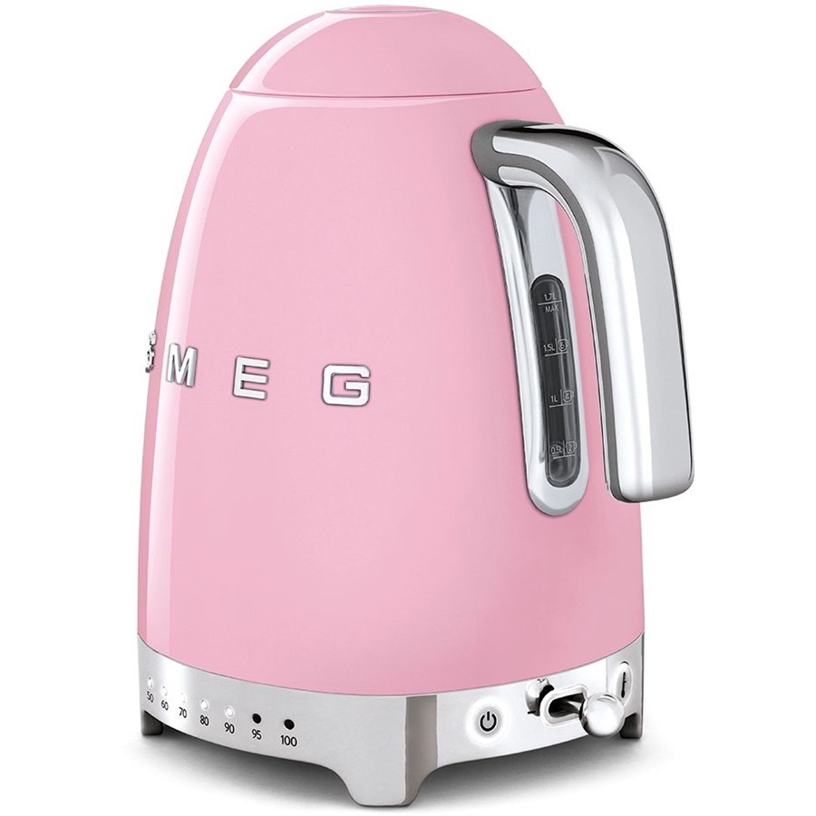 De retrostijl van de SMEG waterkoker komt naar voren in de verscheidenheid aan verkrijgbare kleuren: stoere tinten, zoals rood, zwart en wit en zachte pastelkleuren zoals crème, groen, roze en blauw. Deze kleuren versterken de chromen bodem en de roestvrijstalen details van de schenktuit en de bedieningsknoppen.
