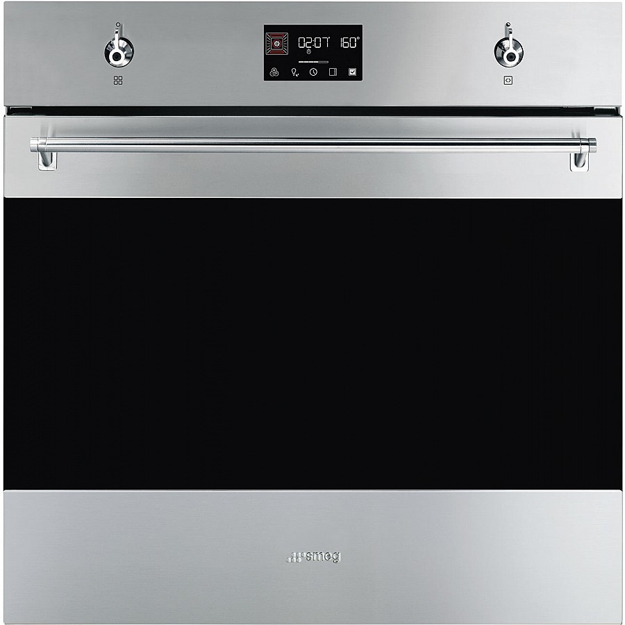 De Smeg SO6302TX is een strak vormgegeven inbouw oven uit de Classici serie uitgevoerd met een netto inhoud van 68 liter en een zuinig energieklasse A+ label. Deze oven heeft een overzichtelijke 2-knops bediening ondersteund met een LCD display waarmee het programma, de tijd, temperatuur e.d. overzichtelijk ingeregeld kan worden.