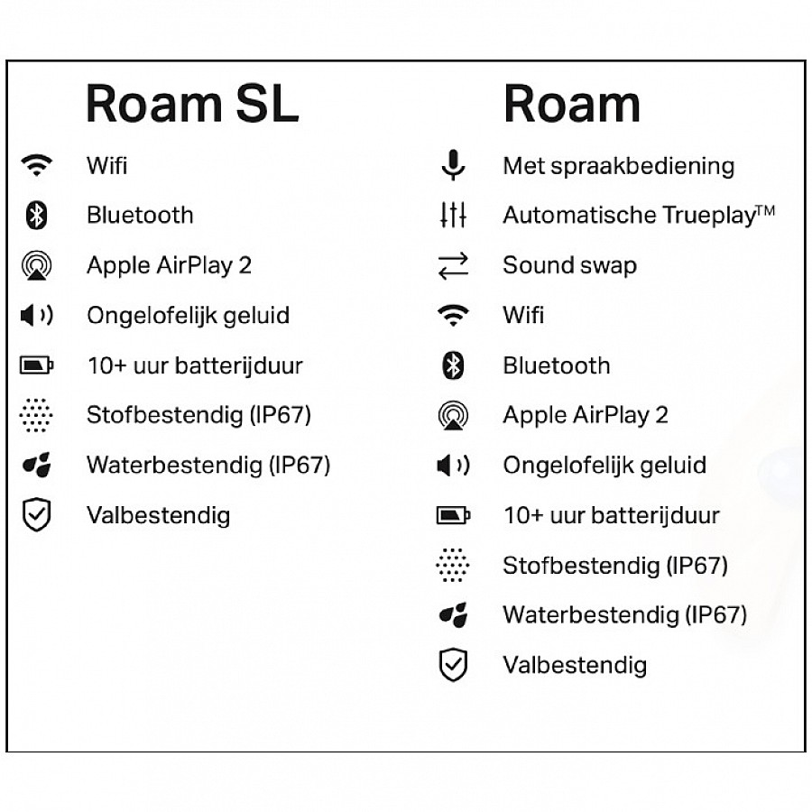 In de woonkamer, de keuken, op je thuiskantoor of in de slaapkamer. En nu ook in de tuin, in het park, op het strand of op vakantie. Met de Sonos Roam SL luister je overal naar de mooiste muziek. Thuis luister je lekker makkelijk via wifi, waardoor je in een handomdraai een multiroomopstelling maakt en je hele huis vult met muziek. Ga je de deur uit, dan maakt de Sonos Roam SL direct verbinding met jouw smartphone, zodat je geen instellingen hoeft te wijzigen en direct verder kan luisteren. En kom je weer thuis, dan maakt de Roam weer automatisch verbinding met wifi zodat je weer gebruik kan maken van alle voordelen van het Sonos-systeem.